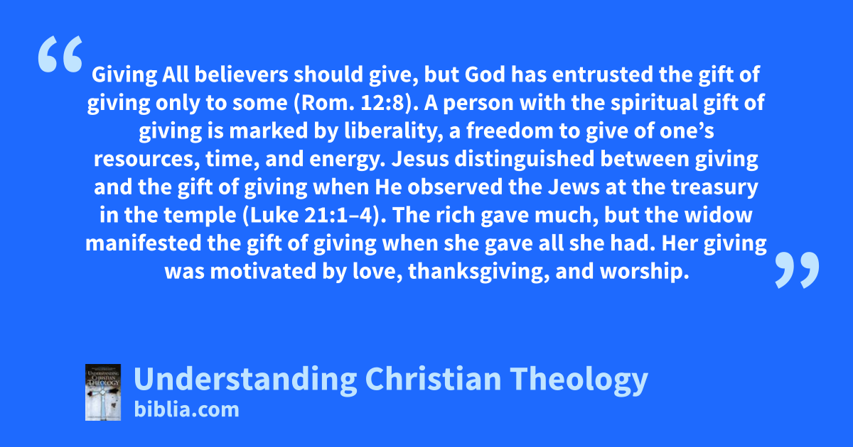 Giving All believers should give, but God has entrusted the gift of giving only to some (Rom. 12:8). A person with the spiritual gift of giving is marked by liberality, a freedom to give of one’s resources, time, and energy. Jesus distinguished between giving and the gift of giving when He observed the Jews at the treasury in the temple (Luke 21:1–4). The rich gave much, but the widow manifested the gift of giving when she gave all she had. Her giving was motivated by love, thanksgiving, and worship.