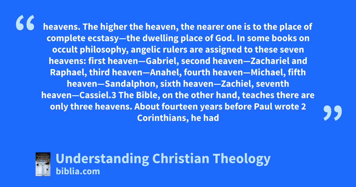 heavens. The higher the heaven, the nearer one is to the place of complete ecstasy—the dwelling place of God. In some books on occult philosophy, angelic rulers are assigned to these seven heavens: first heaven—Gabriel, second heaven—Zachariel and Raphael, third heaven—Anahel, fourth heaven—Michael, fifth heaven—Sandalphon, sixth heaven—Zachiel, seventh heaven—Cassiel.3 The Bible, on the other hand, teaches there are only three heavens. About fourteen years before Paul wrote 2 Corinthians, he had