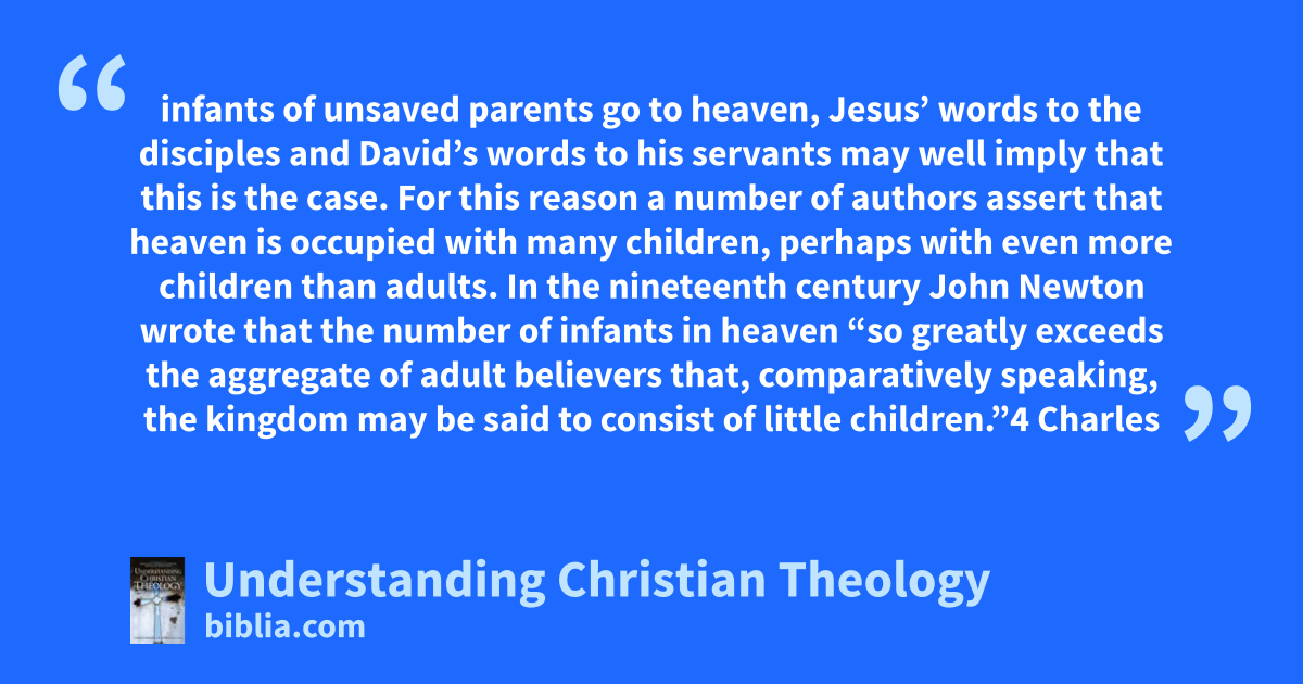 infants of unsaved parents go to heaven, Jesus’ words to the disciples and David’s words to his servants may well imply that this is the case. For this reason a number of authors assert that heaven is occupied with many children, perhaps with even more children than adults. In the nineteenth century John Newton wrote that the number of infants in heaven “so greatly exceeds the aggregate of adult believers that, comparatively speaking, the kingdom may be said to consist of little children.”4 Charles