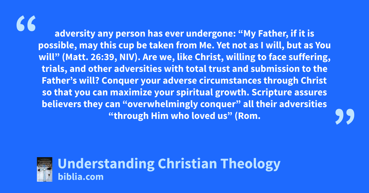 adversity any person has ever undergone: “My Father, if it is possible, may this cup be taken from Me. Yet not as I will, but as You will” (Matt. 26:39, NIV). Are we, like Christ, willing to face suffering, trials, and other adversities with total trust and submission to the Father’s will? Conquer your adverse circumstances through Christ so that you can maximize your spiritual growth. Scripture assures believers they can “overwhelmingly conquer” all their adversities “through Him who loved us” (Rom.
