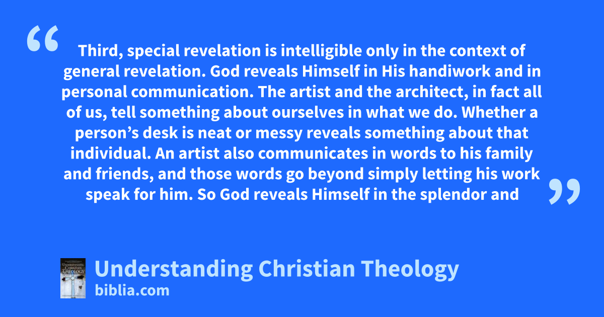 Third, special revelation is intelligible only in the context of general revelation. God reveals Himself in His handiwork and in personal communication. The artist and the architect, in fact all of us, tell something about ourselves in what we do. Whether a person’s desk is neat or messy reveals something about that individual. An artist also communicates in words to his family and friends, and those words go beyond simply letting his work speak for him. So God reveals Himself in the splendor and