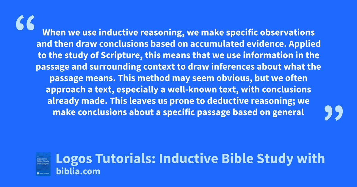 This 3-part tutorial demonstrates how to perform inductive Bible study using Logos Bible Software. This study employs Logos Silver, but it is useful for all users. Knowledge of the original languages of Scripture can be helpful, but this tutorial shows you how to complete an inductive study of the Bible with no knowledge of Greek or Hebrew.