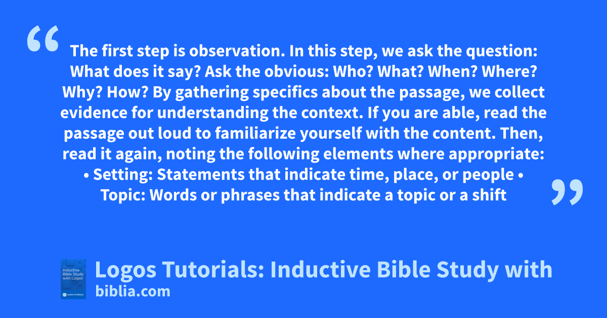 This 3-part tutorial demonstrates how to perform inductive Bible study using Logos Bible Software. This study employs Logos Silver, but it is useful for all users. Knowledge of the original languages of Scripture can be helpful, but this tutorial shows you how to complete an inductive study of the Bible with no knowledge of Greek or Hebrew.