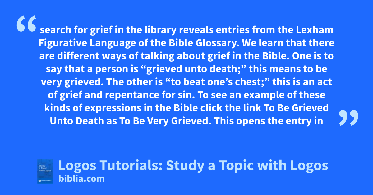 search for grief in the library reveals entries from the Lexham Figurative Language of the Bible Glossary. We learn that there are different ways of talking about grief in the Bible. One is to say that a person is “grieved unto death;” this means to be very grieved. The other is “to beat one’s chest;” this is an act of grief and repentance for sin. To see an example of these kinds of expressions in the Bible click the link To Be Grieved Unto Death as To Be Very Grieved. This opens the entry in