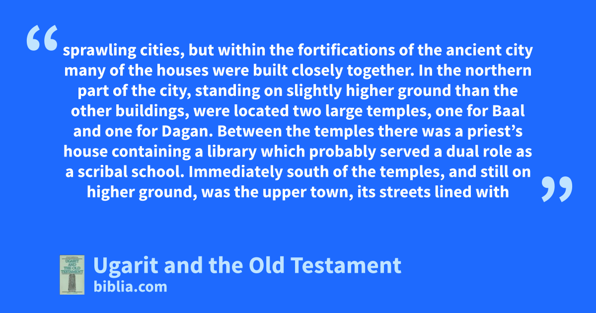 sprawling cities, but within the fortifications of the ancient city many of the houses were built closely together. In the northern part of the city, standing on slightly higher ground than the other buildings, were located two large temples, one for Baal and one for Dagan. Between the temples there was a priest’s house containing a library which probably served a dual role as a scribal school. Immediately south of the temples, and still on higher ground, was the upper town, its streets lined with