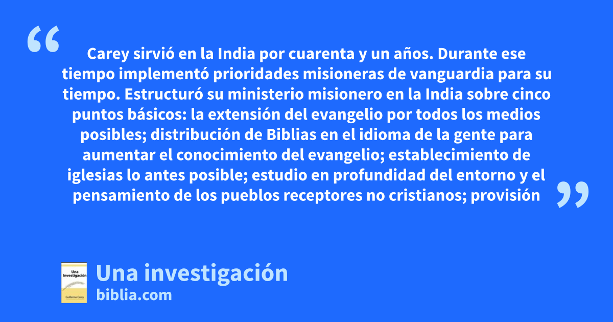 Carey sirvió en la India por cuarenta y un años. Durante ese tiempo implementó prioridades misioneras de vanguardia para su tiempo. Estructuró su ministerio misionero en la India sobre cinco puntos básicos: la extensión del evangelio por todos los medios posibles; distribución de Biblias en el idioma de la gente para aumentar el conocimiento del evangelio; establecimiento de iglesias lo antes posible; estudio en profundidad del entorno y el pensamiento de los pueblos receptores no cristianos; provisión