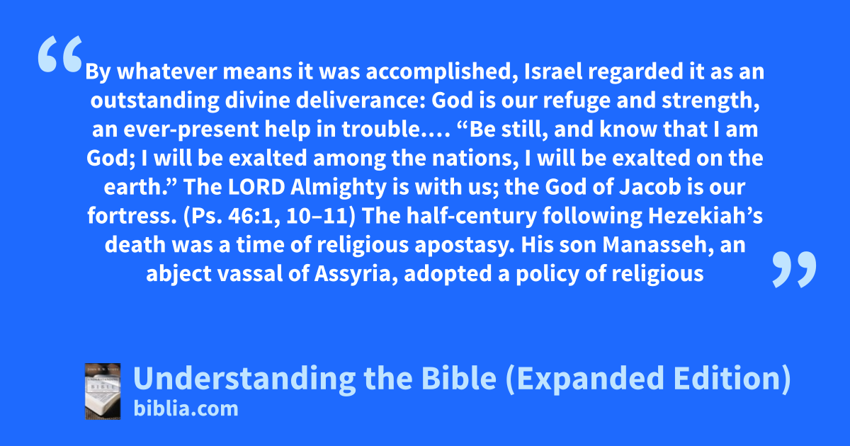 By whatever means it was accomplished, Israel regarded it as an outstanding divine deliverance: God is our refuge and strength, an ever-present help in trouble.… “Be still, and know that I am God; I will be exalted among the nations, I will be exalted on the earth.” The LORD Almighty is with us; the God of Jacob is our fortress. (Ps. 46:1, 10–11) The half-century following Hezekiah’s death was a time of religious apostasy. His son Manasseh, an abject vassal of Assyria, adopted a policy of religious
