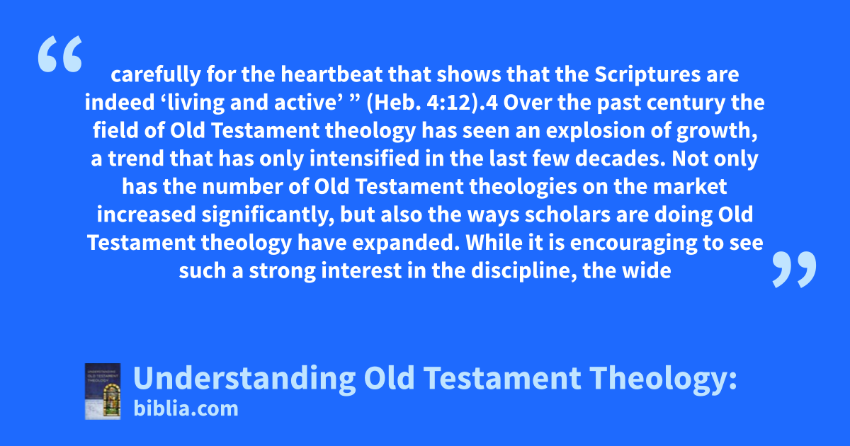 carefully for the heartbeat that shows that the Scriptures are indeed ‘living and active’ ” (Heb. 4:12).4 Over the past century the field of Old Testament theology has seen an explosion of growth, a trend that has only intensified in the last few decades. Not only has the number of Old Testament theologies on the market increased significantly, but also the ways scholars are doing Old Testament theology have expanded. While it is encouraging to see such a strong interest in the discipline, the wide