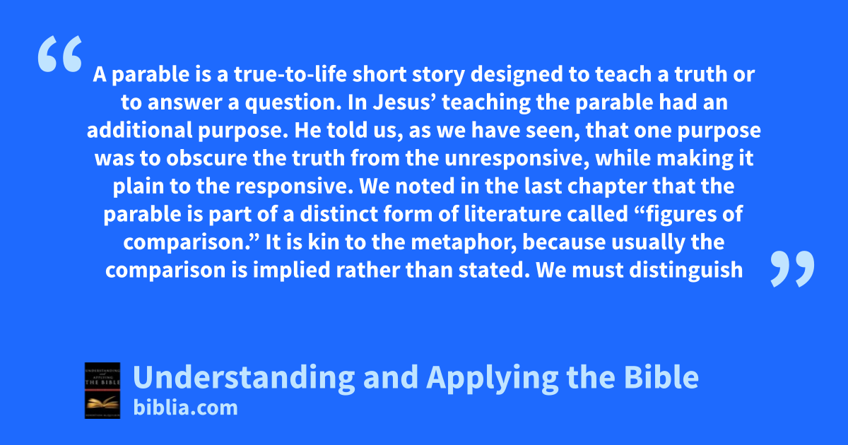 A parable is a true-to-life short story designed to teach a truth or to answer a question. In Jesus’ teaching the parable had an additional purpose. He told us, as we have seen, that one purpose was to obscure the truth from the unresponsive, while making it plain to the responsive. We noted in the last chapter that the parable is part of a distinct form of literature called “figures of comparison.” It is kin to the metaphor, because usually the comparison is implied rather than stated. We must distinguish