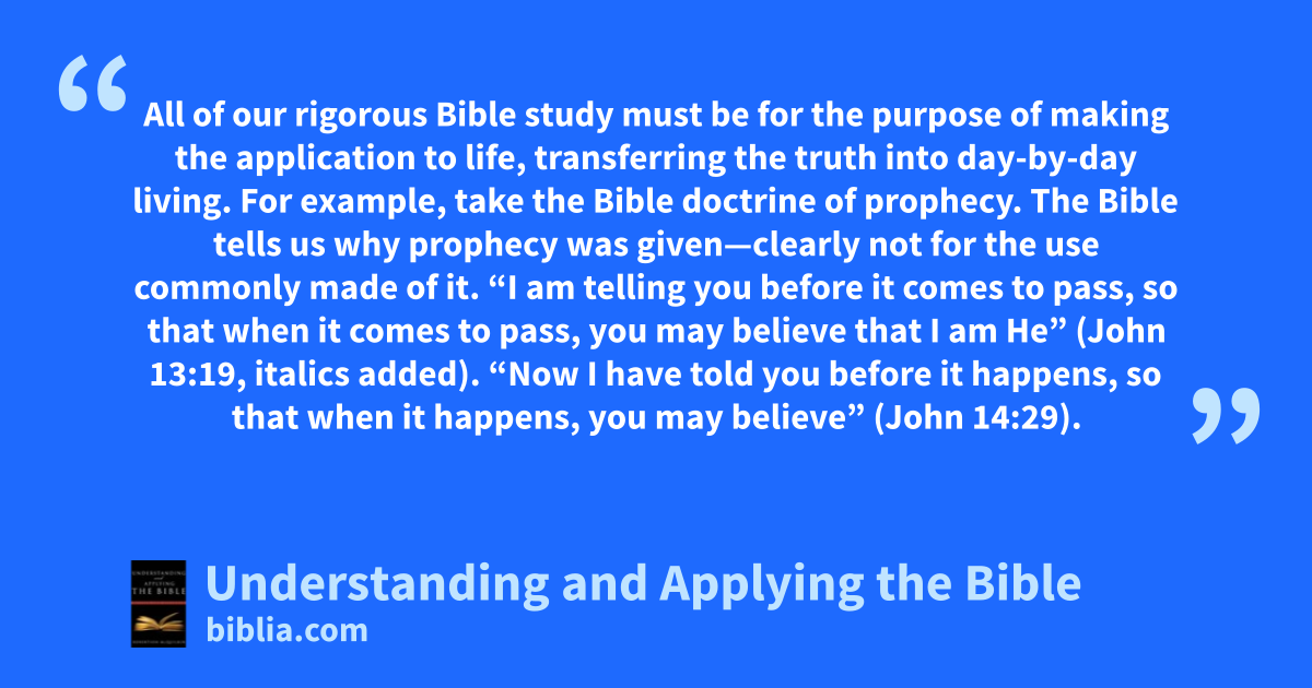 All of our rigorous Bible study must be for the purpose of making the application to life, transferring the truth into day-by-day living. For example, take the Bible doctrine of prophecy. The Bible tells us why prophecy was given—clearly not for the use commonly made of it. “I am telling you before it comes to pass, so that when it comes to pass, you may believe that I am He” (John 13:19, italics added). “Now I have told you before it happens, so that when it happens, you may believe” (John 14:29).