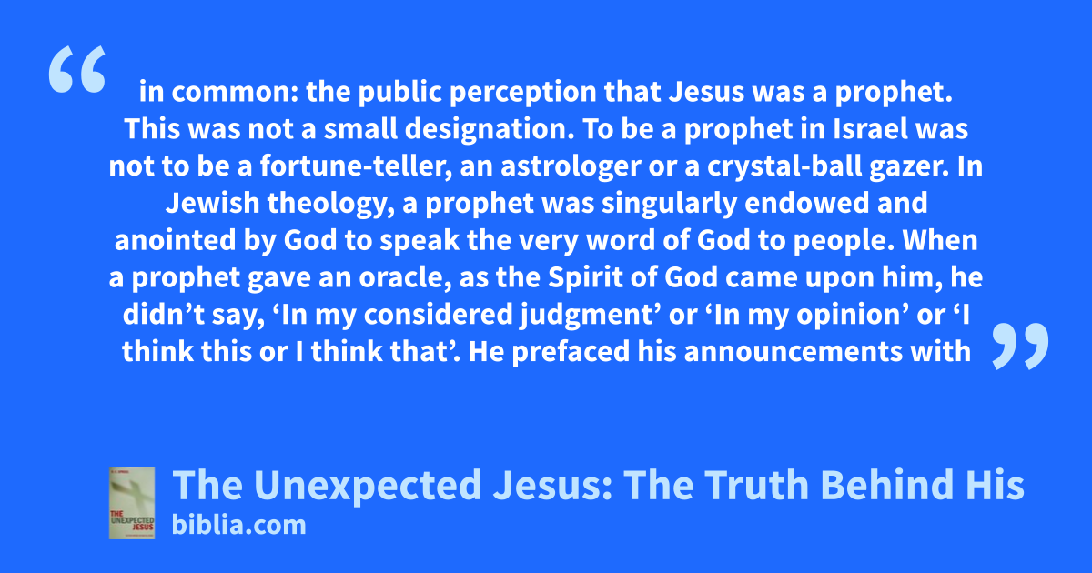 in common: the public perception that Jesus was a prophet. This was not a small designation. To be a prophet in Israel was not to be a fortune-teller, an astrologer or a crystal-ball gazer. In Jewish theology, a prophet was singularly endowed and anointed by God to speak the very word of God to people. When a prophet gave an oracle, as the Spirit of God came upon him, he didn’t say, ‘In my considered judgment’ or ‘In my opinion’ or ‘I think this or I think that’. He prefaced his announcements with