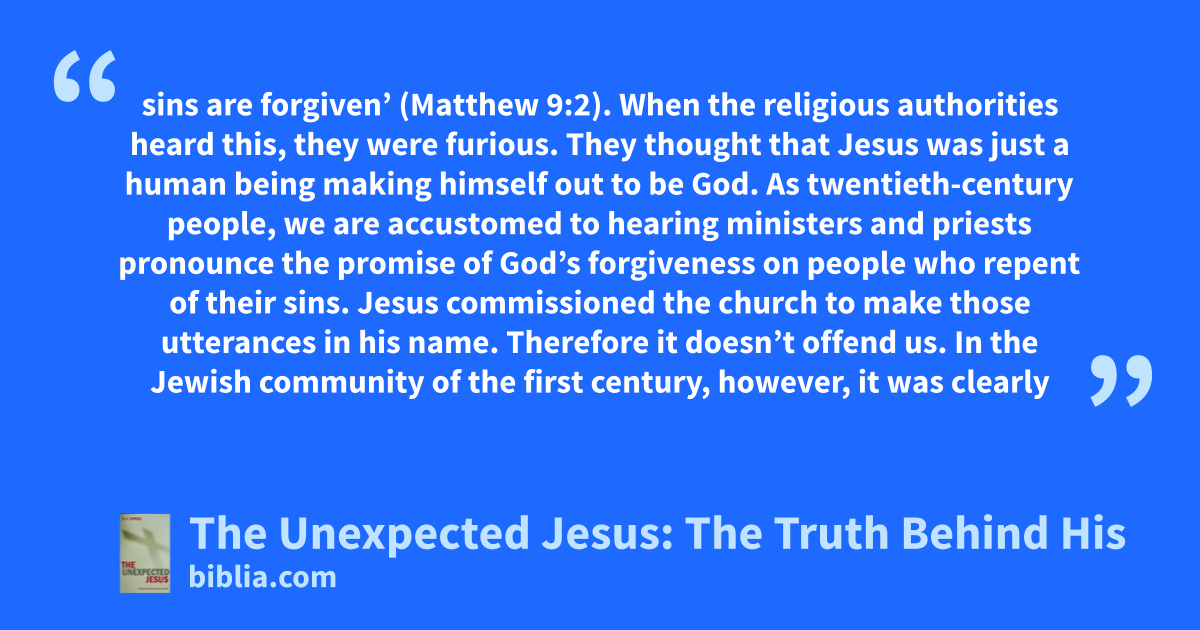 sins are forgiven’ (Matthew 9:2). When the religious authorities heard this, they were furious. They thought that Jesus was just a human being making himself out to be God. As twentieth-century people, we are accustomed to hearing ministers and priests pronounce the promise of God’s forgiveness on people who repent of their sins. Jesus commissioned the church to make those utterances in his name. Therefore it doesn’t offend us. In the Jewish community of the first century, however, it was clearly