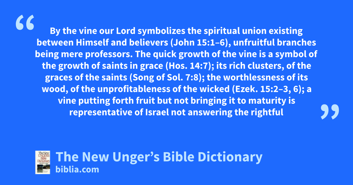 By the vine our Lord symbolizes the spiritual union existing between Himself and believers (John 15:1–6), unfruitful branches being mere professors. The quick growth of the vine is a symbol of the growth of saints in grace (Hos. 14:7); its rich clusters, of the graces of the saints (Song of Sol. 7:8); the worthlessness of its wood, of the unprofitableness of the wicked (Ezek. 15:2–3, 6); a vine putting forth fruit but not bringing it to maturity is representative of Israel not answering the rightful