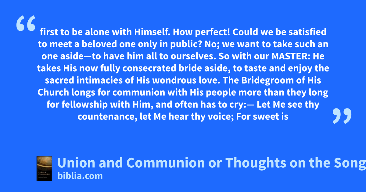 first to be alone with Himself. How perfect! Could we be satisfied to meet a beloved one only in public? No; we want to take such an one aside—to have him all to ourselves. So with our MASTER: He takes His now fully consecrated bride aside, to taste and enjoy the sacred intimacies of His wondrous love. The Bridegroom of His Church longs for communion with His people more than they long for fellowship with Him, and often has to cry:— Let Me see thy countenance, let Me hear thy voice; For sweet is