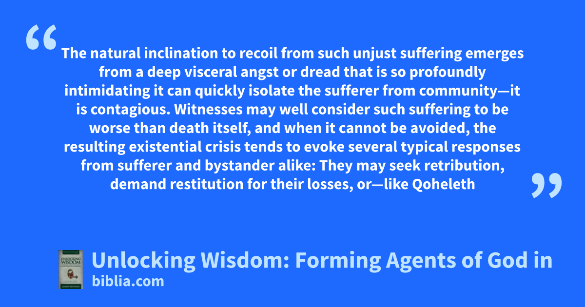 The natural inclination to recoil from such unjust suffering emerges from a deep visceral angst or dread that is so profoundly intimidating it can quickly isolate the sufferer from community—it is contagious. Witnesses may well consider such suffering to be worse than death itself, and when it cannot be avoided, the resulting existential crisis tends to evoke several typical responses from sufferer and bystander alike: They may seek retribution, demand restitution for their losses, or—like Qoheleth