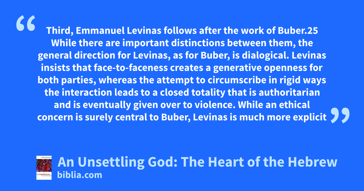 Third, Emmanuel Levinas follows after the work of Buber.25 While there are important distinctions between them, the general direction for Levinas, as for Buber, is dialogical. Levinas insists that face-to-faceness creates a generative openness for both parties, whereas the attempt to circumscribe in rigid ways the interaction leads to a closed totality that is authoritarian and is eventually given over to violence. While an ethical concern is surely central to Buber, Levinas is much more explicit
