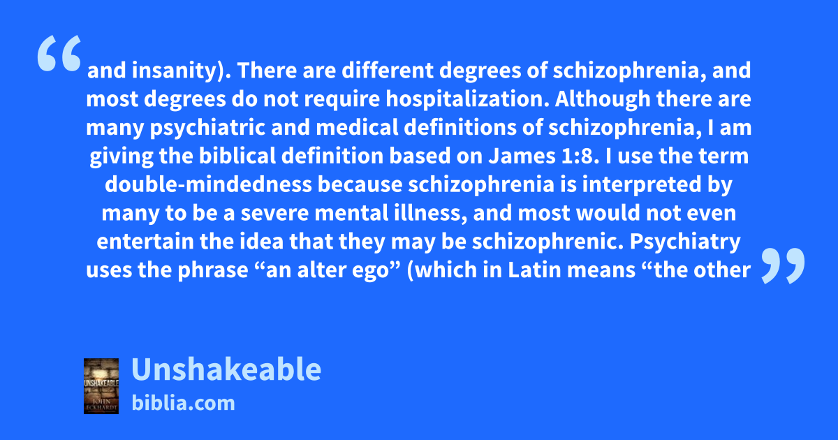 and insanity). There are different degrees of schizophrenia, and most degrees do not require hospitalization. Although there are many psychiatric and medical definitions of schizophrenia, I am giving the biblical definition based on James 1:8. I use the term double-mindedness because schizophrenia is interpreted by many to be a severe mental illness, and most would not even entertain the idea that they may be schizophrenic. Psychiatry uses the phrase “an alter ego” (which in Latin means “the other