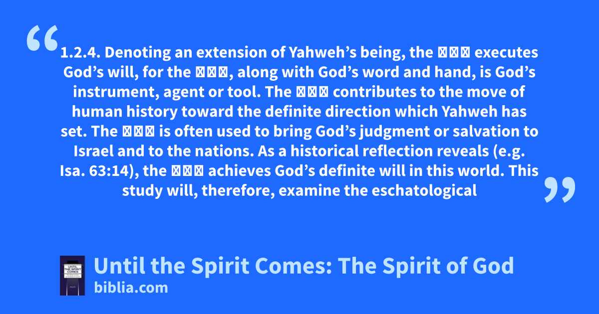 1.2.4. Denoting an extension of Yahweh’s being, the רוח executes God’s will, for the רוח, along with God’s word and hand, is God’s instrument, agent or tool. The רוח contributes to the move of human history toward the definite direction which Yahweh has set. The רוח is often used to bring God’s judgment or salvation to Israel and to the nations. As a historical reflection reveals (e.g. Isa. 63:14), the רוח achieves God’s definite will in this world. This study will, therefore, examine the eschatological