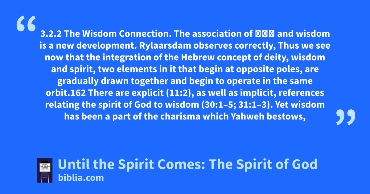 3.2.2 The Wisdom Connection. The association of רוח and wisdom is a new development. Rylaarsdam observes correctly, Thus we see now that the integration of the Hebrew concept of deity, wisdom and spirit, two elements in it that begin at opposite poles, are gradually drawn together and begin to operate in the same orbit.162 There are explicit (11:2), as well as implicit, references relating the spirit of God to wisdom (30:1–5; 31:1–3). Yet wisdom has been a part of the charisma which Yahweh bestows,