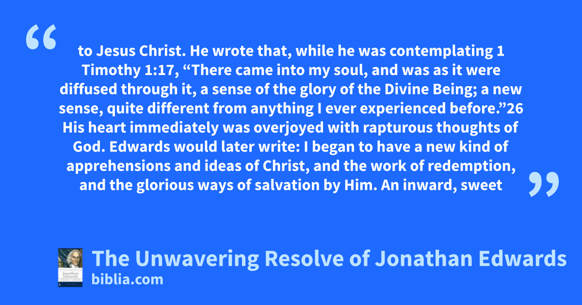 to Jesus Christ. He wrote that, while he was contemplating 1 Timothy 1:17, “There came into my soul, and was as it were diffused through it, a sense of the glory of the Divine Being; a new sense, quite different from anything I ever experienced before.”26 His heart immediately was overjoyed with rapturous thoughts of God. Edwards would later write: I began to have a new kind of apprehensions and ideas of Christ, and the work of redemption, and the glorious ways of salvation by Him. An inward, sweet