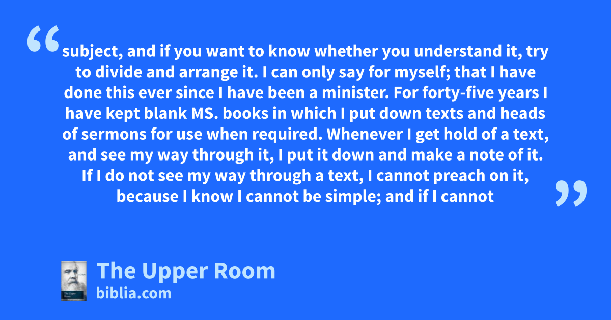 subject, and if you want to know whether you understand it, try to divide and arrange it. I can only say for myself; that I have done this ever since I have been a minister. For forty-five years I have kept blank MS. books in which I put down texts and heads of sermons for use when required. Whenever I get hold of a text, and see my way through it, I put it down and make a note of it. If I do not see my way through a text, I cannot preach on it, because I know I cannot be simple; and if I cannot