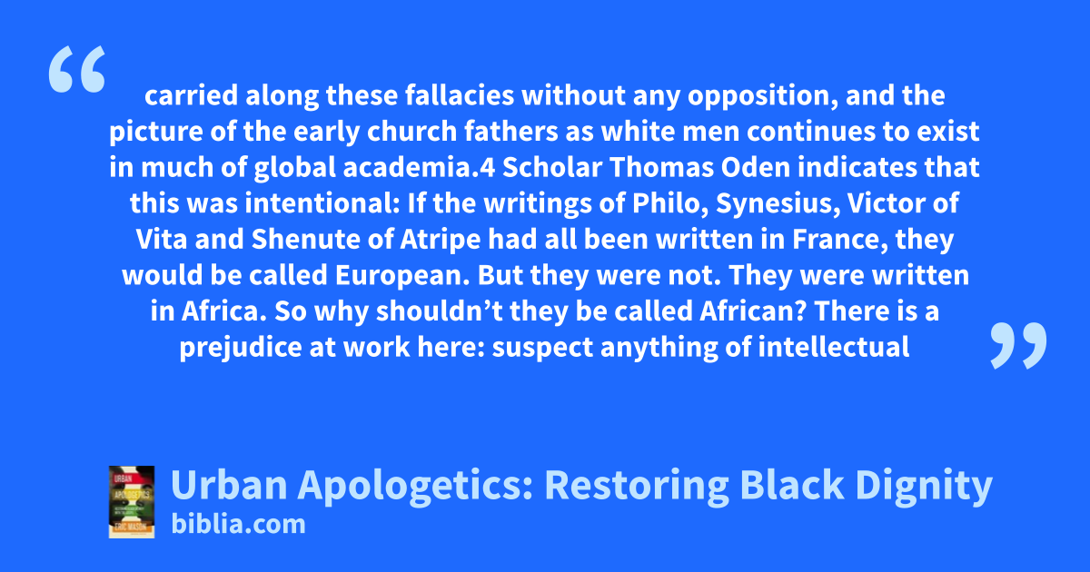 carried along these fallacies without any opposition, and the picture of the early church fathers as white men continues to exist in much of global academia.4 Scholar Thomas Oden indicates that this was intentional: If the writings of Philo, Synesius, Victor of Vita and Shenute of Atripe had all been written in France, they would be called European. But they were not. They were written in Africa. So why shouldn’t they be called African? There is a prejudice at work here: suspect anything of intellectual