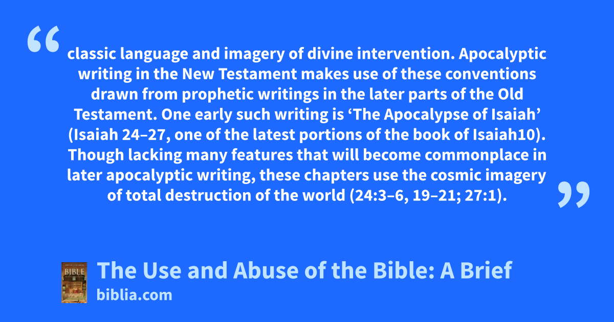 classic language and imagery of divine intervention. Apocalyptic writing in the New Testament makes use of these conventions drawn from prophetic writings in the later parts of the Old Testament. One early such writing is ‘The Apocalypse of Isaiah’ (Isaiah 24–27, one of the latest portions of the book of Isaiah10). Though lacking many features that will become commonplace in later apocalyptic writing, these chapters use the cosmic imagery of total destruction of the world (24:3–6, 19–21; 27:1).