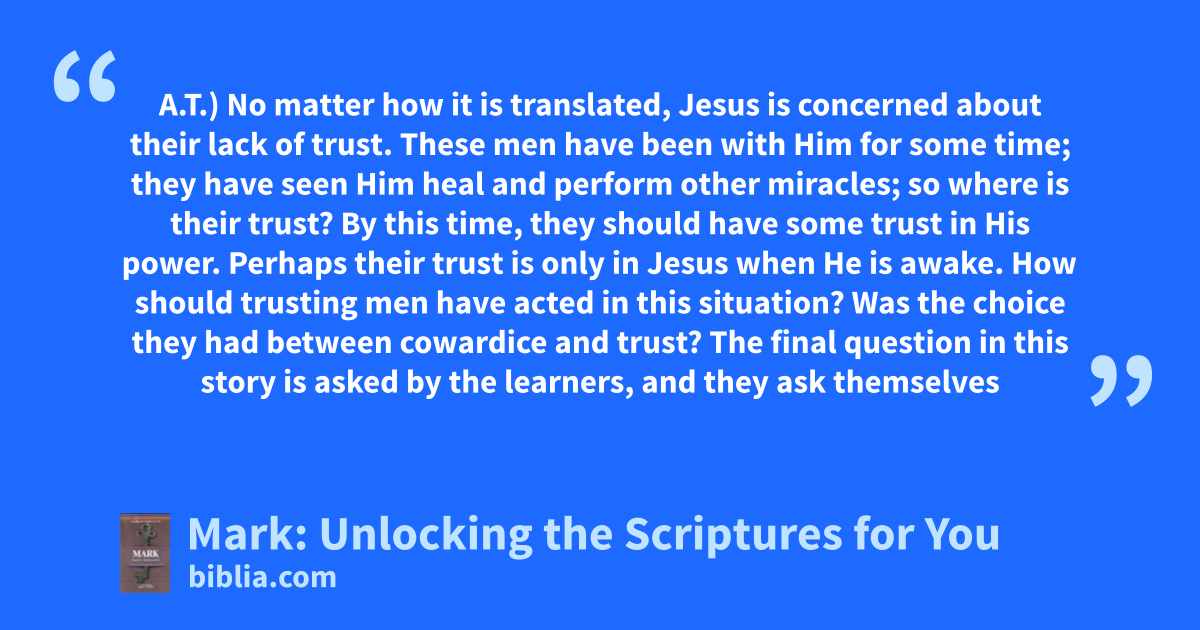 A.T.) No matter how it is translated, Jesus is concerned about their lack of trust. These men have been with Him for some time; they have seen Him heal and perform other miracles; so where is their trust? By this time, they should have some trust in His power. Perhaps their trust is only in Jesus when He is awake. How should trusting men have acted in this situation? Was the choice they had between cowardice and trust? The final question in this story is asked by the learners, and they ask themselves