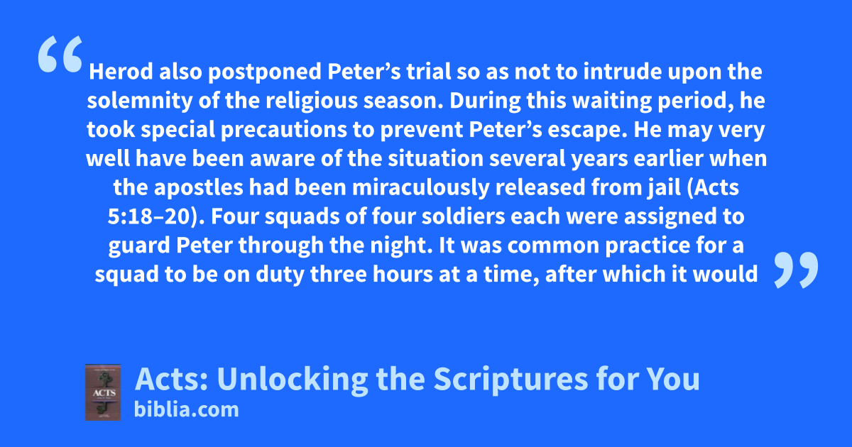 Herod also postponed Peter’s trial so as not to intrude upon the solemnity of the religious season. During this waiting period, he took special precautions to prevent Peter’s escape. He may very well have been aware of the situation several years earlier when the apostles had been miraculously released from jail (Acts 5:18–20). Four squads of four soldiers each were assigned to guard Peter through the night. It was common practice for a squad to be on duty three hours at a time, after which it would