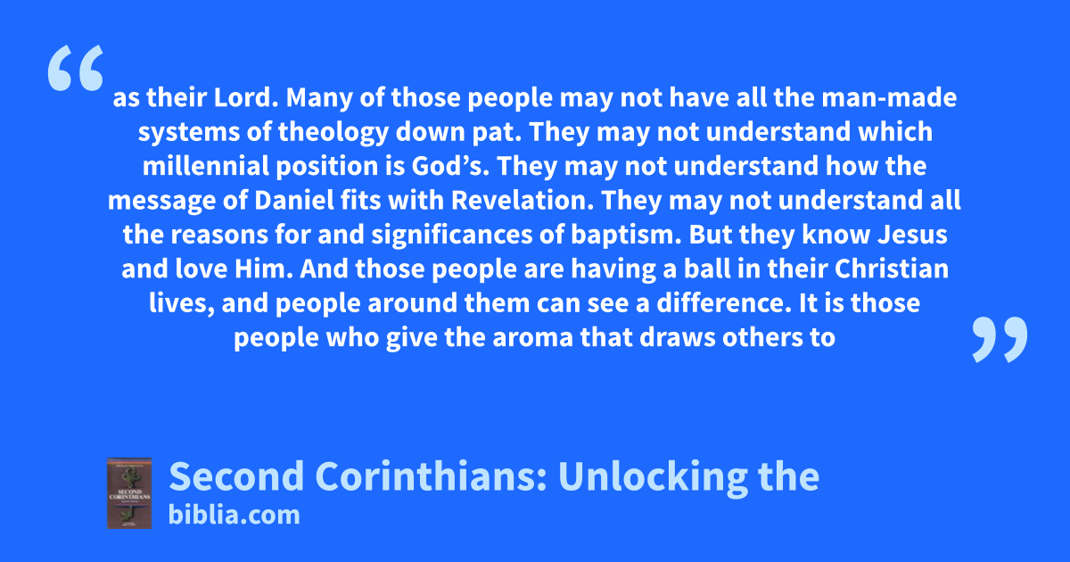 as their Lord. Many of those people may not have all the man-made systems of theology down pat. They may not understand which millennial position is God’s. They may not understand how the message of Daniel fits with Revelation. They may not understand all the reasons for and significances of baptism. But they know Jesus and love Him. And those people are having a ball in their Christian lives, and people around them can see a difference. It is those people who give the aroma that draws others to