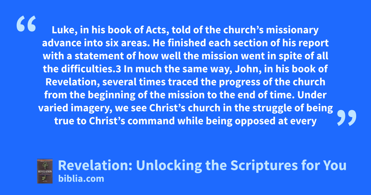 Luke, in his book of Acts, told of the church’s missionary advance into six areas. He finished each section of his report with a statement of how well the mission went in spite of all the difficulties.3 In much the same way, John, in his book of Revelation, several times traced the progress of the church from the beginning of the mission to the end of time. Under varied imagery, we see Christ’s church in the struggle of being true to Christ’s command while being opposed at every