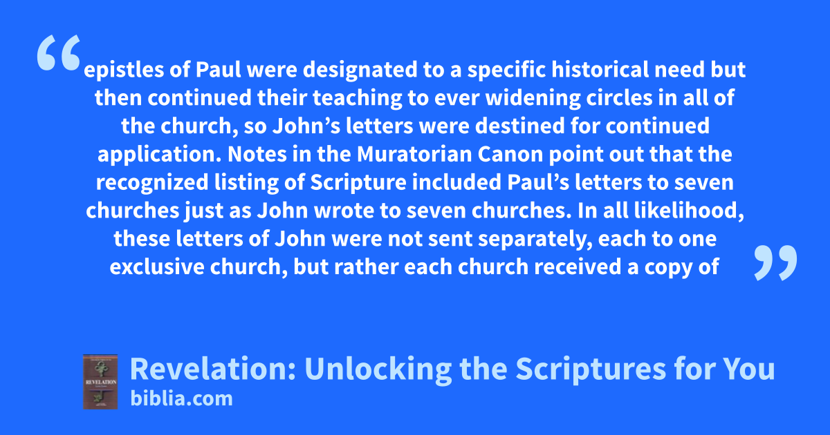 epistles of Paul were designated to a specific historical need but then continued their teaching to ever widening circles in all of the church, so John’s letters were destined for continued application. Notes in the Muratorian Canon point out that the recognized listing of Scripture included Paul’s letters to seven churches just as John wrote to seven churches. In all likelihood, these letters of John were not sent separately, each to one exclusive church, but rather each church received a copy of