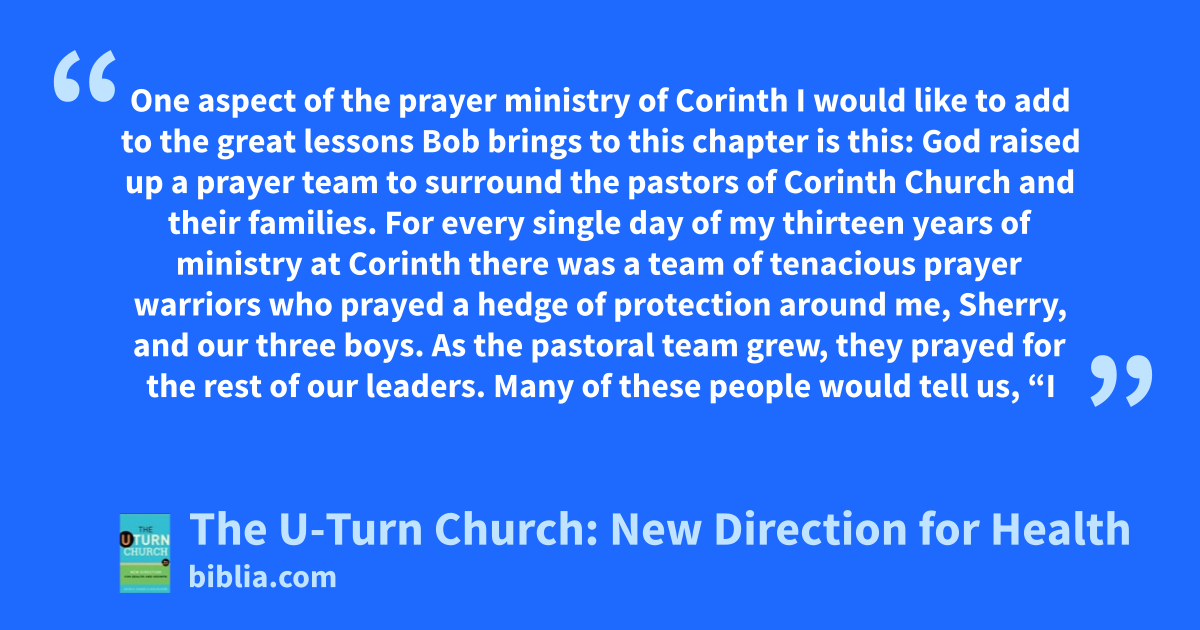 One aspect of the prayer ministry of Corinth I would like to add to the great lessons Bob brings to this chapter is this: God raised up a prayer team to surround the pastors of Corinth Church and their families. For every single day of my thirteen years of ministry at Corinth there was a team of tenacious prayer warriors who prayed a hedge of protection around me, Sherry, and our three boys. As the pastoral team grew, they prayed for the rest of our leaders. Many of these people would tell us, “I