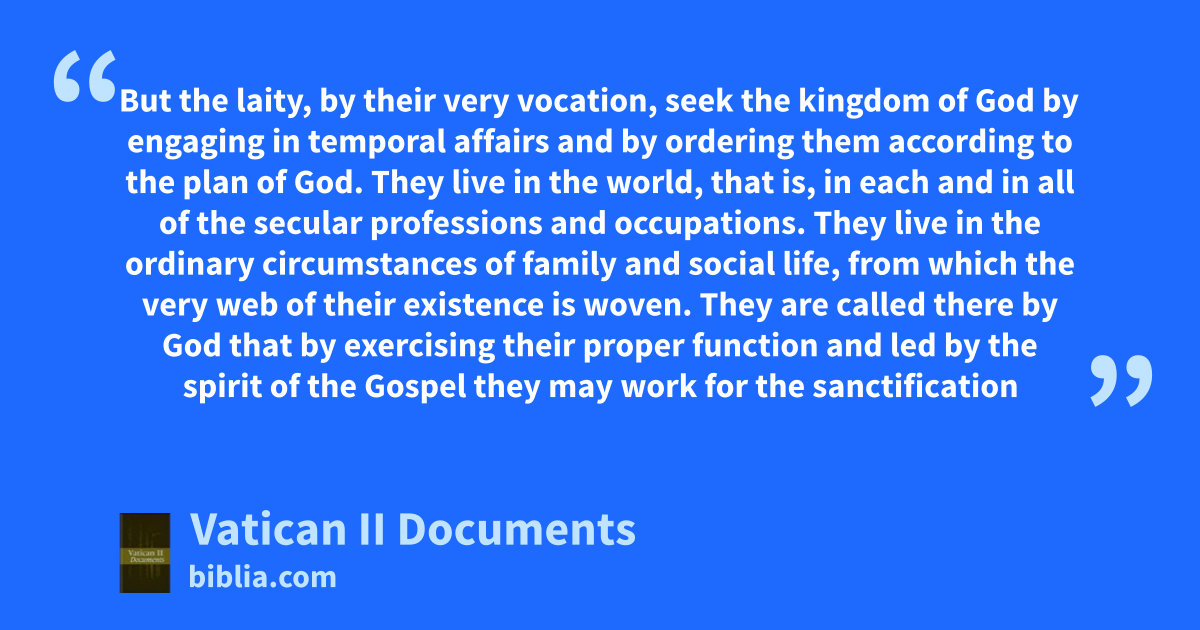 But the laity, by their very vocation, seek the kingdom of God by engaging in temporal affairs and by ordering them according to the plan of God. They live in the world, that is, in each and in all of the secular professions and occupations. They live in the ordinary circumstances of family and social life, from which the very web of their existence is woven. They are called there by God that by exercising their proper function and led by the spirit of the Gospel they may work for the sanctification