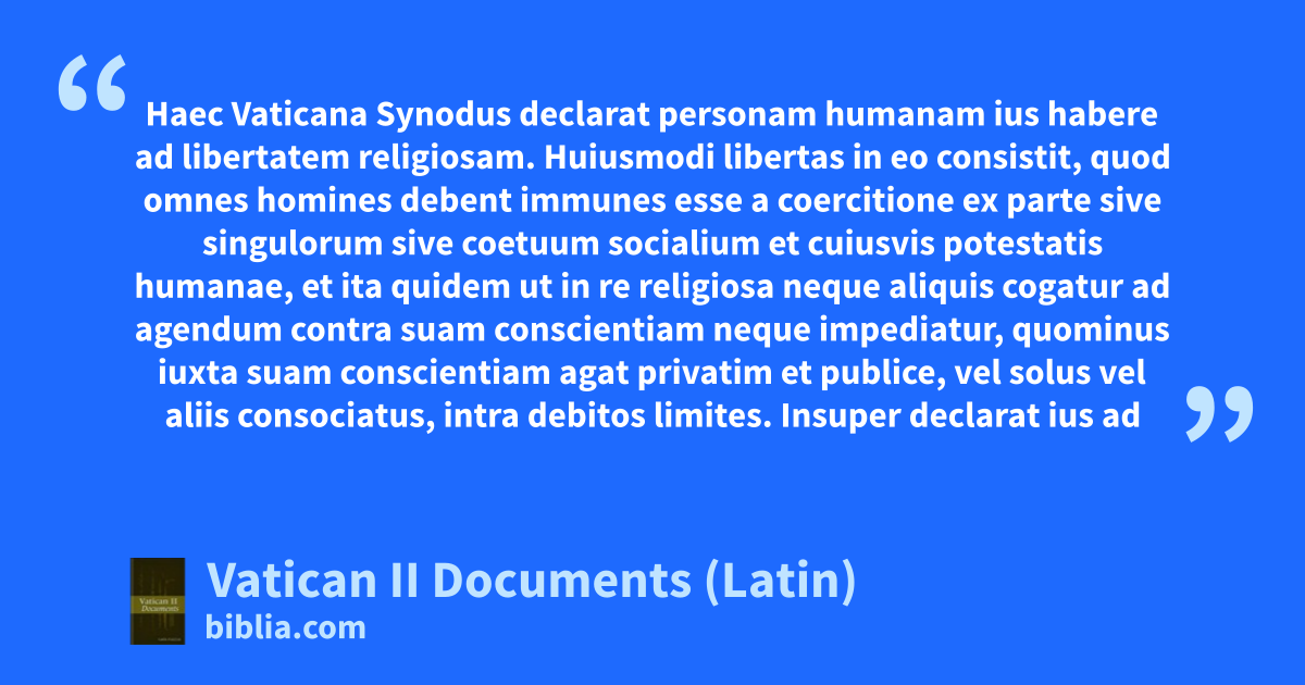 Haec Vaticana Synodus declarat personam humanam ius habere ad libertatem religiosam. Huiusmodi libertas in eo consistit, quod omnes homines debent immunes esse a coercitione ex parte sive singulorum sive coetuum socialium et cuiusvis potestatis humanae, et ita quidem ut in re religiosa neque aliquis cogatur ad agendum contra suam conscientiam neque impediatur, quominus iuxta suam conscientiam agat privatim et publice, vel solus vel aliis consociatus, intra debitos limites. Insuper declarat ius ad