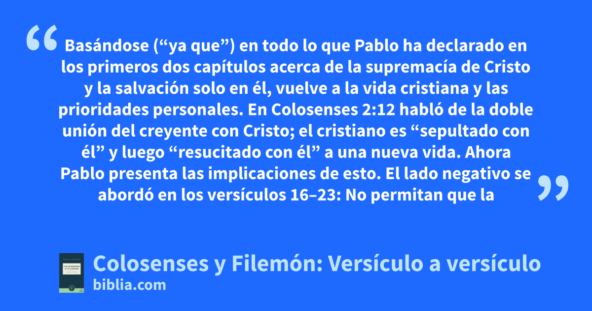 Basándose (“ya que”) en todo lo que Pablo ha declarado en los primeros dos capítulos acerca de la supremacía de Cristo y la salvación solo en él, vuelve a la vida cristiana y las prioridades personales. En Colosenses 2:12 habló de la doble unión del creyente con Cristo; el cristiano es “sepultado con él” y luego “resucitado con él” a una nueva vida. Ahora Pablo presenta las implicaciones de esto. El lado negativo se abordó en los versículos 16–23: No permitan que la