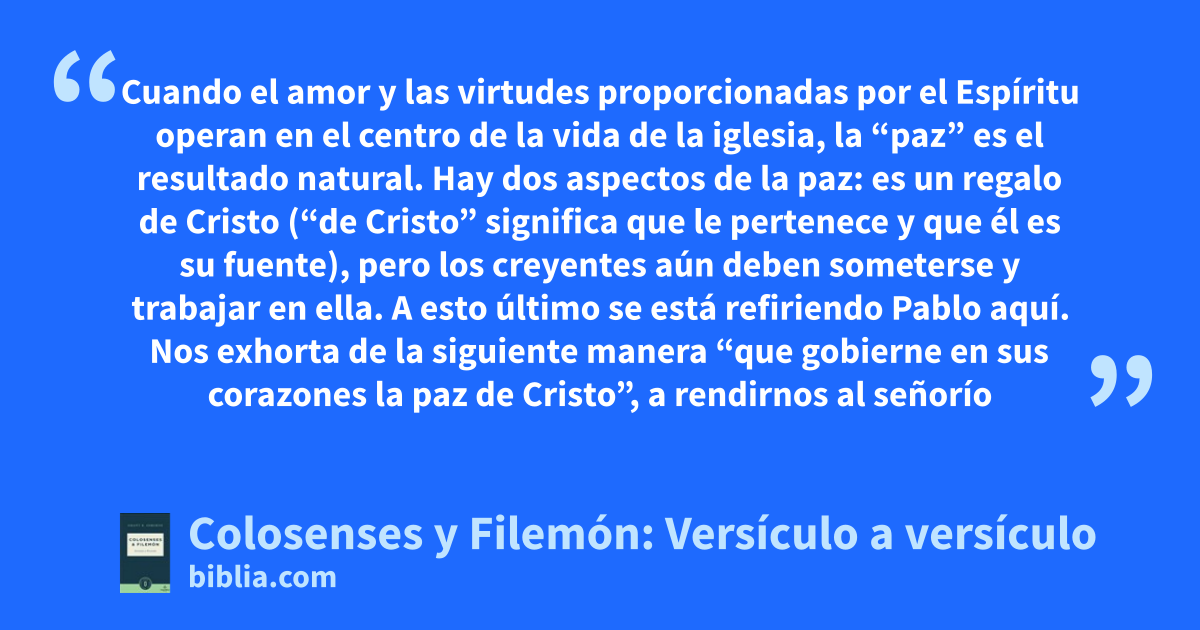 Cuando el amor y las virtudes proporcionadas por el Espíritu operan en el centro de la vida de la iglesia, la “paz” es el resultado natural. Hay dos aspectos de la paz: es un regalo de Cristo (“de Cristo” significa que le pertenece y que él es su fuente), pero los creyentes aún deben someterse y trabajar en ella. A esto último se está refiriendo Pablo aquí. Nos exhorta de la siguiente manera “que gobierne en sus corazones la paz de Cristo”, a rendirnos al señorío