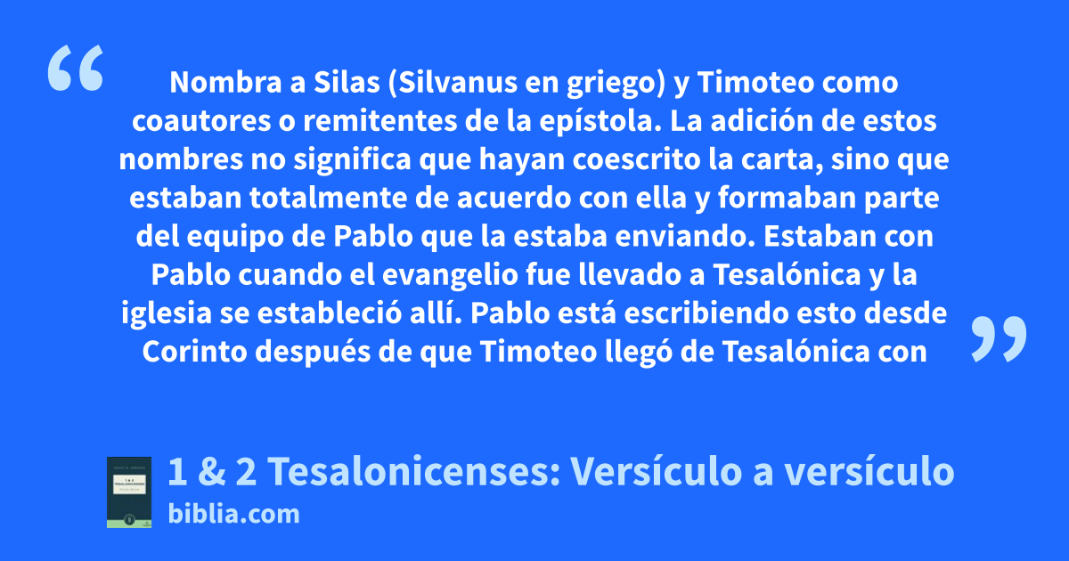 Nombra a Silas (Silvanus en griego) y Timoteo como coautores o remitentes de la epístola. La adición de estos nombres no significa que hayan coescrito la carta, sino que estaban totalmente de acuerdo con ella y formaban parte del equipo de Pablo que la estaba enviando. Estaban con Pablo cuando el evangelio fue llevado a Tesalónica y la iglesia se estableció allí. Pablo está escribiendo esto desde Corinto después de que Timoteo llegó de Tesalónica con