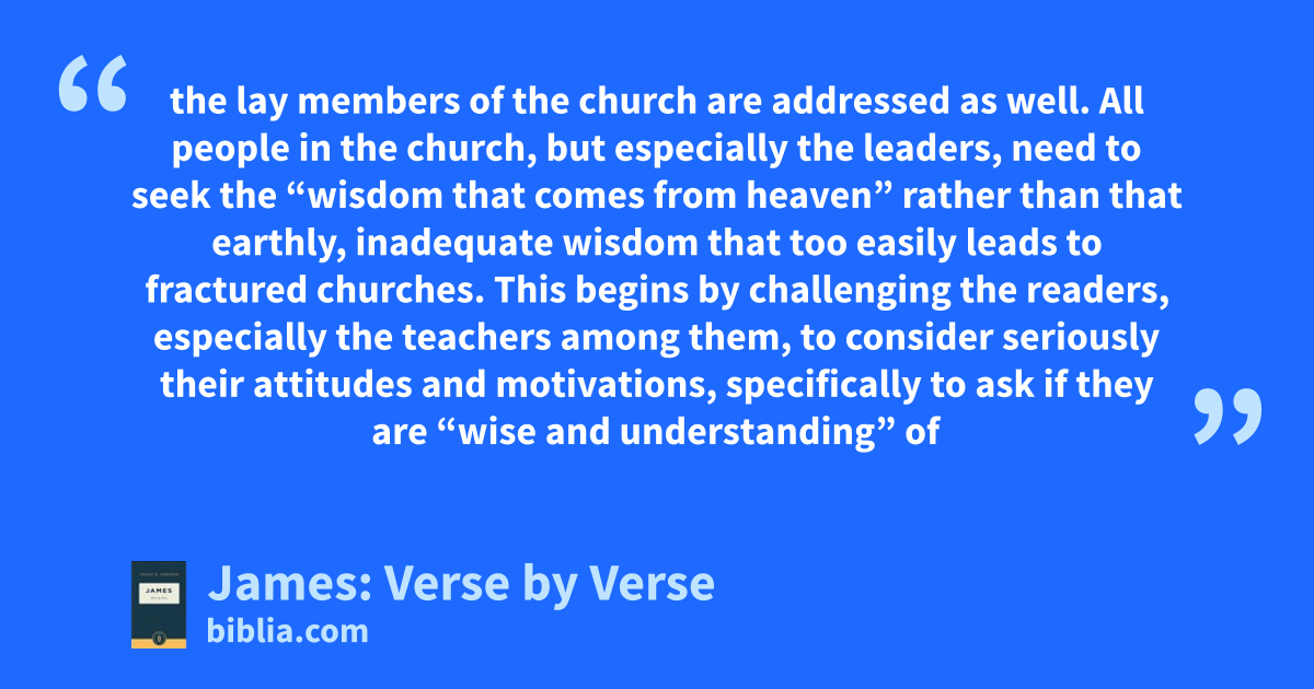 the lay members of the church are addressed as well. All people in the church, but especially the leaders, need to seek the “wisdom that comes from heaven” rather than that earthly, inadequate wisdom that too easily leads to fractured churches. This begins by challenging the readers, especially the teachers among them, to consider seriously their attitudes and motivations, specifically to ask if they are “wise and understanding” of
