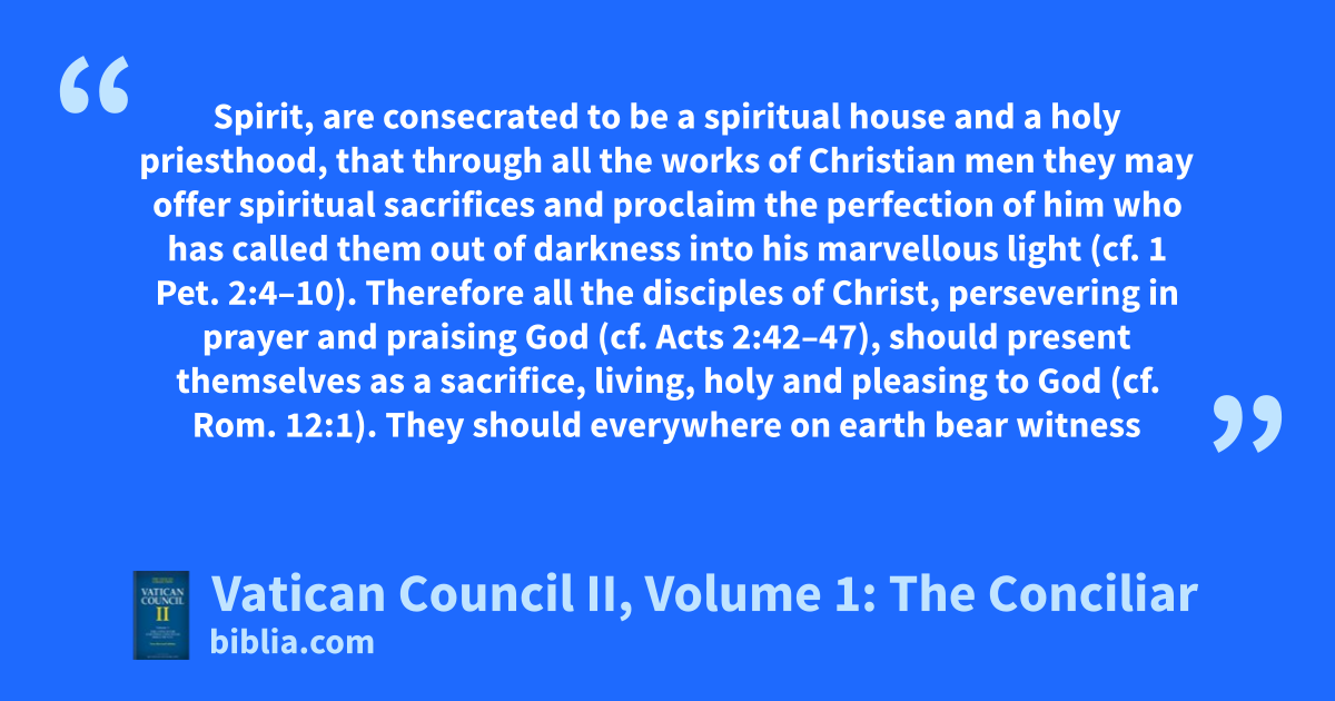 Spirit, are consecrated to be a spiritual house and a holy priesthood, that through all the works of Christian men they may offer spiritual sacrifices and proclaim the perfection of him who has called them out of darkness into his marvellous light (cf. 1 Pet. 2:4–10). Therefore all the disciples of Christ, persevering in prayer and praising God (cf. Acts 2:42–47), should present themselves as a sacrifice, living, holy and pleasing to God (cf. Rom. 12:1). They should everywhere on earth bear witness