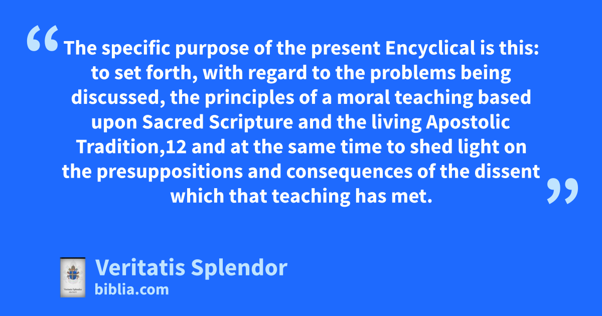 The specific purpose of the present Encyclical is this: to set forth, with regard to the problems being discussed, the principles of a moral teaching based upon Sacred Scripture and the living Apostolic Tradition,12 and at the same time to shed light on the presuppositions and consequences of the dissent which that teaching has met.