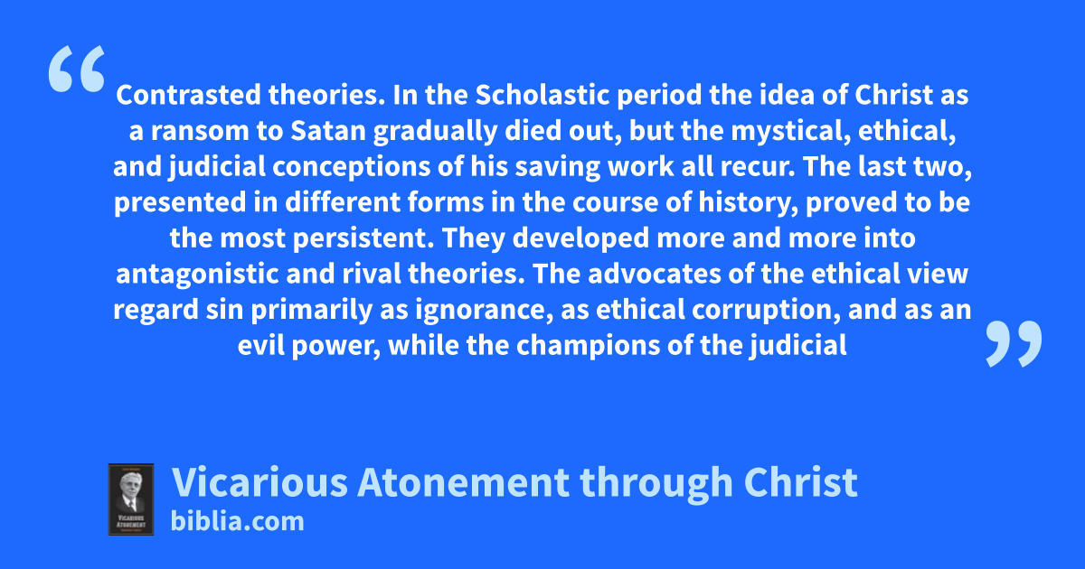 Contrasted theories. In the Scholastic period the idea of Christ as a ransom to Satan gradually died out, but the mystical, ethical, and judicial conceptions of his saving work all recur. The last two, presented in different forms in the course of history, proved to be the most persistent. They developed more and more into antagonistic and rival theories. The advocates of the ethical view regard sin primarily as ignorance, as ethical corruption, and as an evil power, while the champions of the judicial