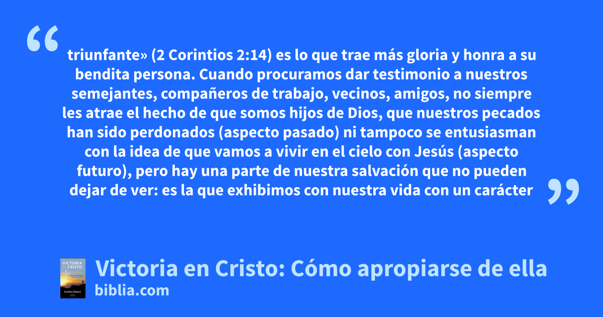 triunfante» (2 Corintios 2:14) es lo que trae más gloria y honra a su bendita persona. Cuando procuramos dar testimonio a nuestros semejantes, compañeros de trabajo, vecinos, amigos, no siempre les atrae el hecho de que somos hijos de Dios, que nuestros pecados han sido perdonados (aspecto pasado) ni tampoco se entusiasman con la idea de que vamos a vivir en el cielo con Jesús (aspecto futuro), pero hay una parte de nuestra salvación que no pueden dejar de ver: es la que exhibimos con nuestra vida con un carácter