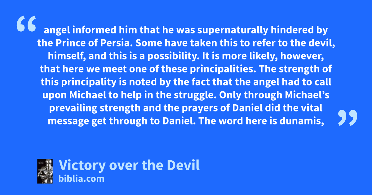 angel informed him that he was supernaturally hindered by the Prince of Persia. Some have taken this to refer to the devil, himself, and this is a possibility. It is more likely, however, that here we meet one of these principalities. The strength of this principality is noted by the fact that the angel had to call upon Michael to help in the struggle. Only through Michael’s prevailing strength and the prayers of Daniel did the vital message get through to Daniel. The word here is dunamis,