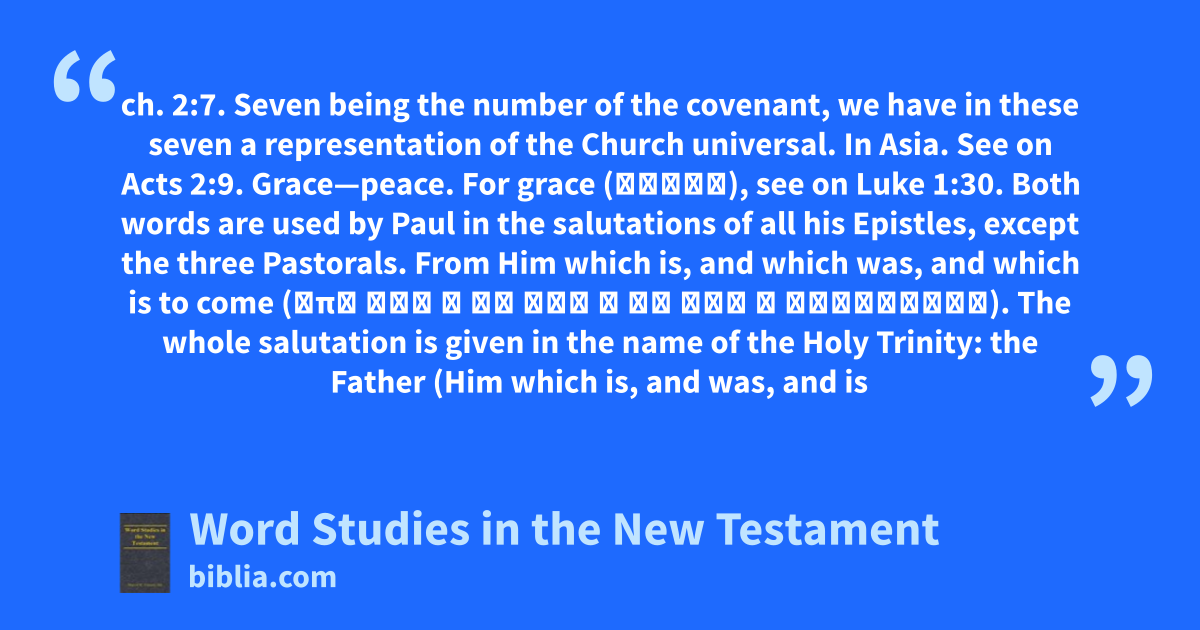 ch. 2:7. Seven being the number of the covenant, we have in these seven a representation of the Church universal. In Asia. See on Acts 2:9. Grace—peace. For grace (χάρις), see on Luke 1:30. Both words are used by Paul in the salutations of all his Epistles, except the three Pastorals. From Him which is, and which was, and which is to come (ἀπὸ τοῦ ὁ ὢν καὶ ὁ ἦν καὶ ὁ ἐρχόμενος). The whole salutation is given in the name of the Holy Trinity: the Father (Him which is, and was, and is