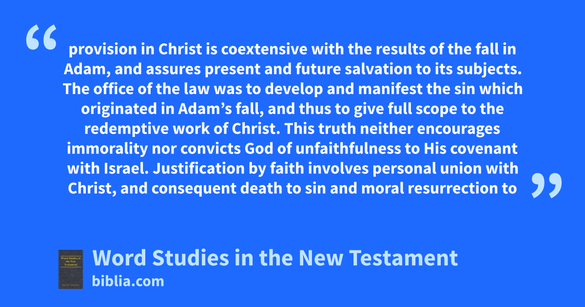 provision in Christ is coextensive with the results of the fall in Adam, and assures present and future salvation to its subjects. The office of the law was to develop and manifest the sin which originated in Adam’s fall, and thus to give full scope to the redemptive work of Christ. This truth neither encourages immorality nor convicts God of unfaithfulness to His covenant with Israel. Justification by faith involves personal union with Christ, and consequent death to sin and moral resurrection to