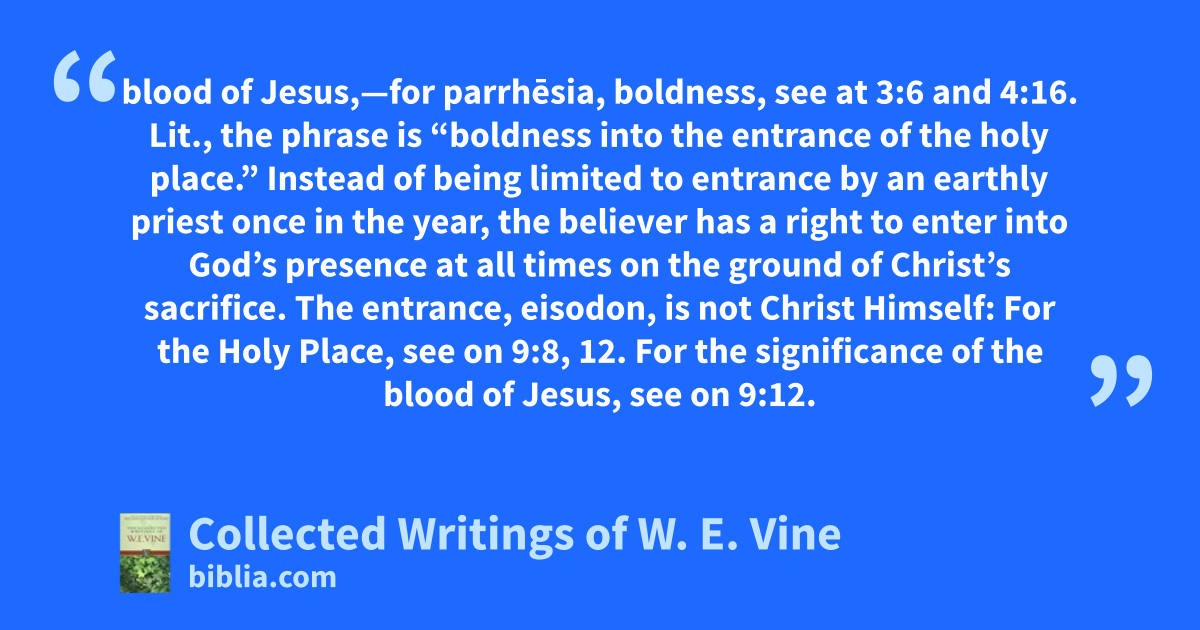 blood of Jesus,—for parrhēsia, boldness, see at 3:6 and 4:16. Lit., the phrase is “boldness into the entrance of the holy place.” Instead of being limited to entrance by an earthly priest once in the year, the believer has a right to enter into God’s presence at all times on the ground of Christ’s sacrifice. The entrance, eisodon, is not Christ Himself: For the Holy Place, see on 9:8, 12. For the significance of the blood of Jesus, see on 9:12.