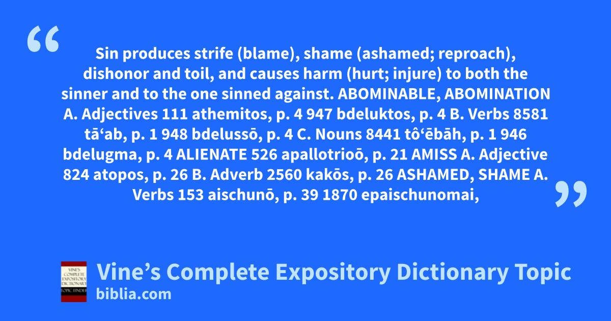 Sin produces strife (blame), shame (ashamed; reproach), dishonor and toil, and causes harm (hurt; injure) to both the sinner and to the one sinned against. ABOMINABLE, ABOMINATION A. Adjectives 111 athemitos, p. 4 947 bdeluktos, p. 4 B. Verbs 8581 tā‘ab, p. 1 948 bdelussō, p. 4 C. Nouns 8441 tô‘ēbāh, p. 1 946 bdelugma, p. 4 ALIENATE 526 apallotrioō, p. 21 AMISS A. Adjective 824 atopos, p. 26 B. Adverb 2560 kakōs, p. 26 ASHAMED, SHAME A. Verbs 153 aischunō, p. 39 1870 epaischunomai,