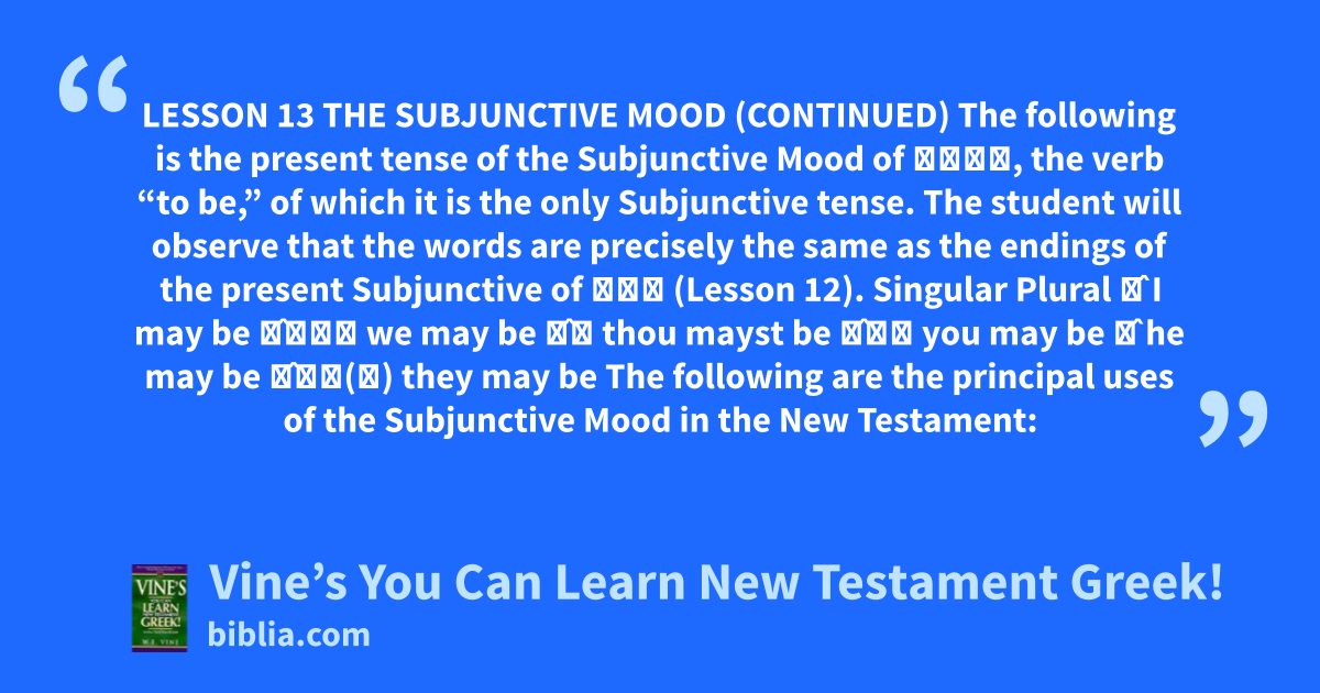 LESSON 13 THE SUBJUNCTIVE MOOD (CONTINUED) The following is the present tense of the Subjunctive Mood of εἰμί, the verb “to be,” of which it is the only Subjunctive tense. The student will observe that the words are precisely the same as the endings of the present Subjunctive of λύω (Lesson 12). Singular Plural ὠ̂ I may be ὠ̂μεν we may be ᾐ̂ς thou mayst be ἠ̂τε you may be ᾐ̂ he may be ὠ̂σι(ν) they may be The following are the principal uses of the Subjunctive Mood in the New Testament: