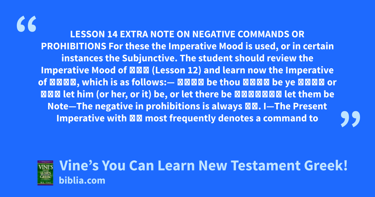 LESSON 14 EXTRA NOTE ON NEGATIVE COMMANDS OR PROHIBITIONS For these the Imperative Mood is used, or in certain instances the Subjunctive. The student should review the Imperative Mood of λύω (Lesson 12) and learn now the Imperative of εἰμί, which is as follows:— ἴσθι be thou ἔστε be ye ἔσθω or ἤτω let him (or her, or it) be, or let there be ἔστωσαν let them be Note—The negative in prohibitions is always μή. I—The Present Imperative with μή most frequently denotes a command to